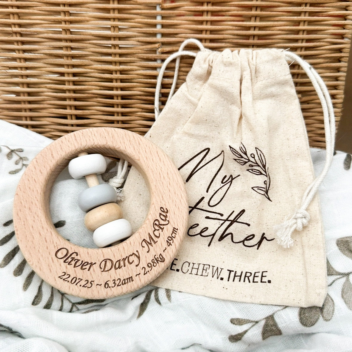 Our wooden teethers are packaged in our reusable cotton calico bags, perfect for storing your teether between chomp sessions and a gorgeous finishing touch for baby gifts.